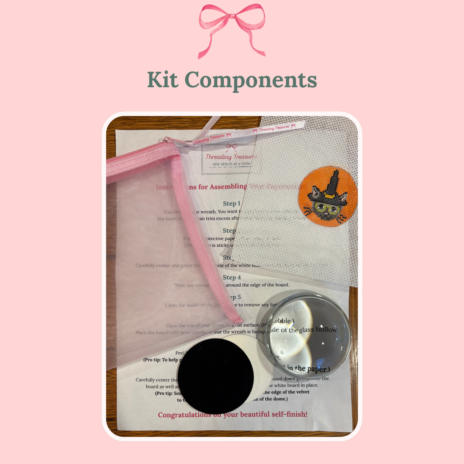 *Paperweight Kit includes hand painted Halloween cat canvas, paperweight kit, project bag, assembly instructions, and a size 22 tapestry needle. Stand-alone canvas includes a size 22 tapestry needle.